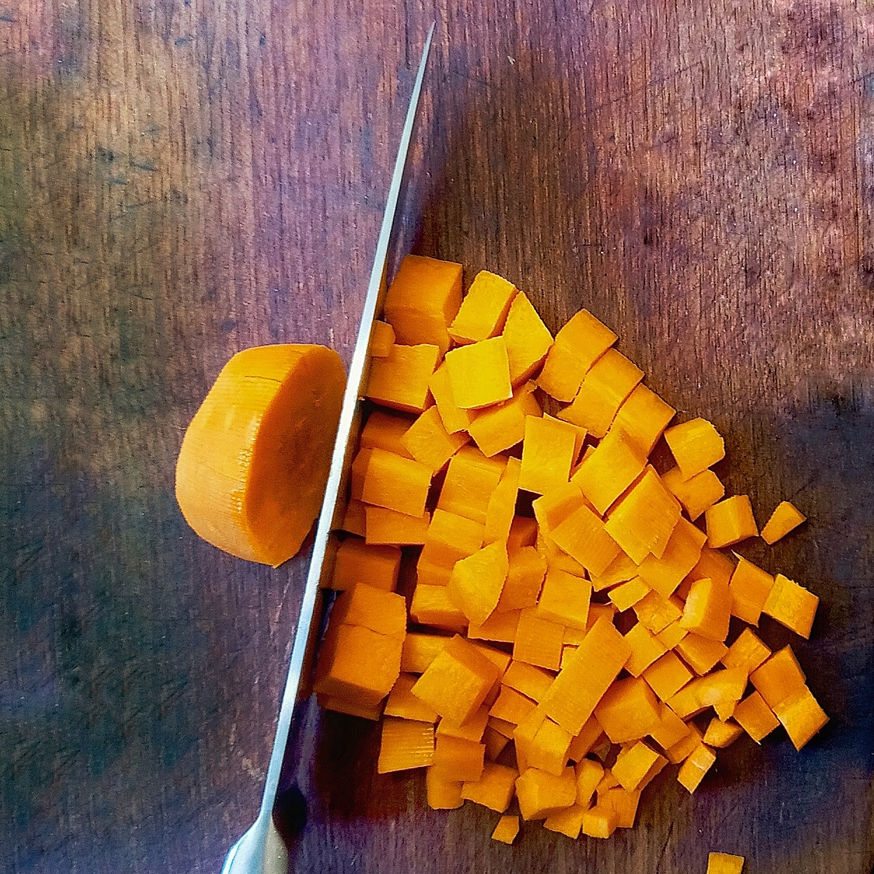 Prepara un mirepoix con las chayotas, la zanahoria y los calabacines.